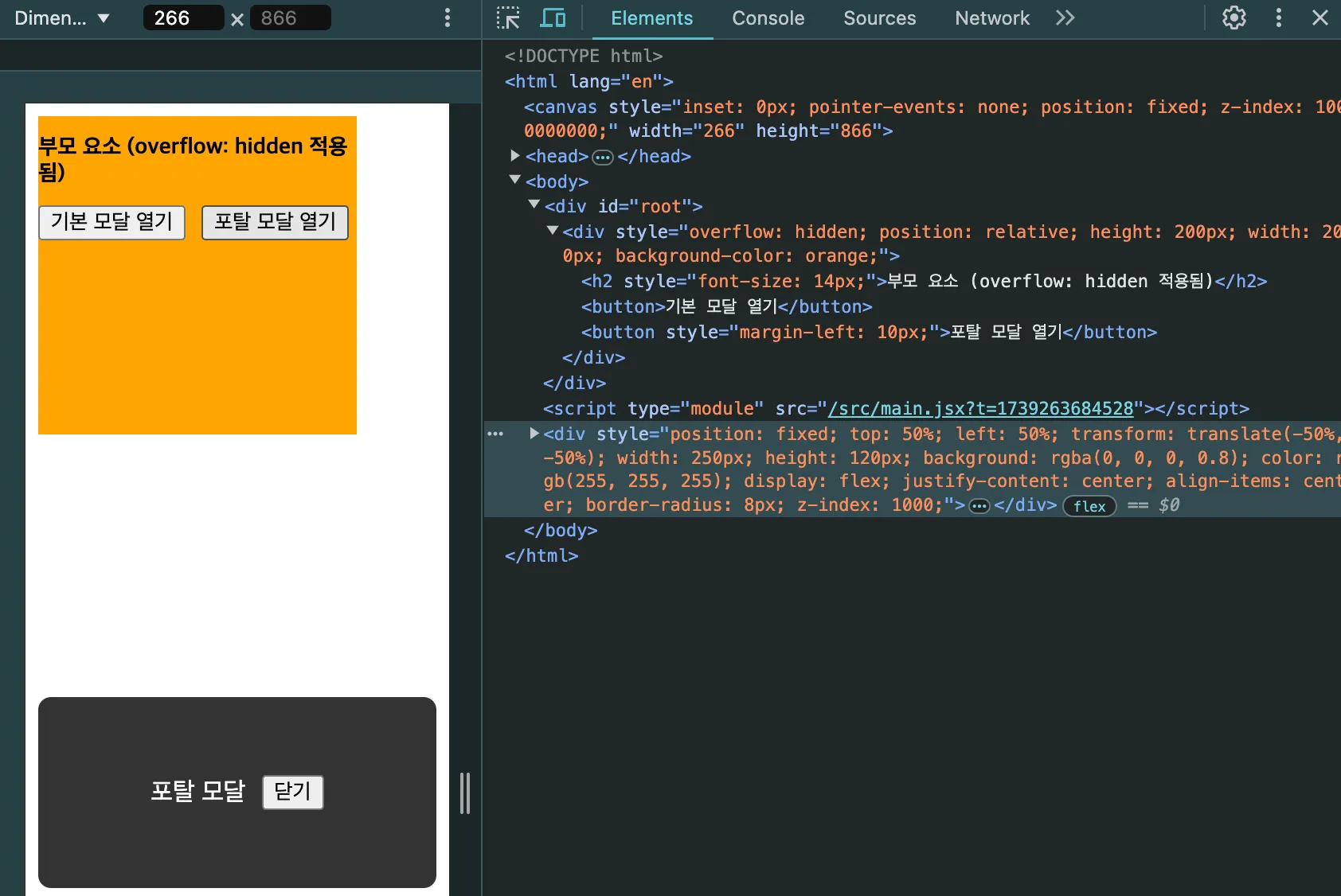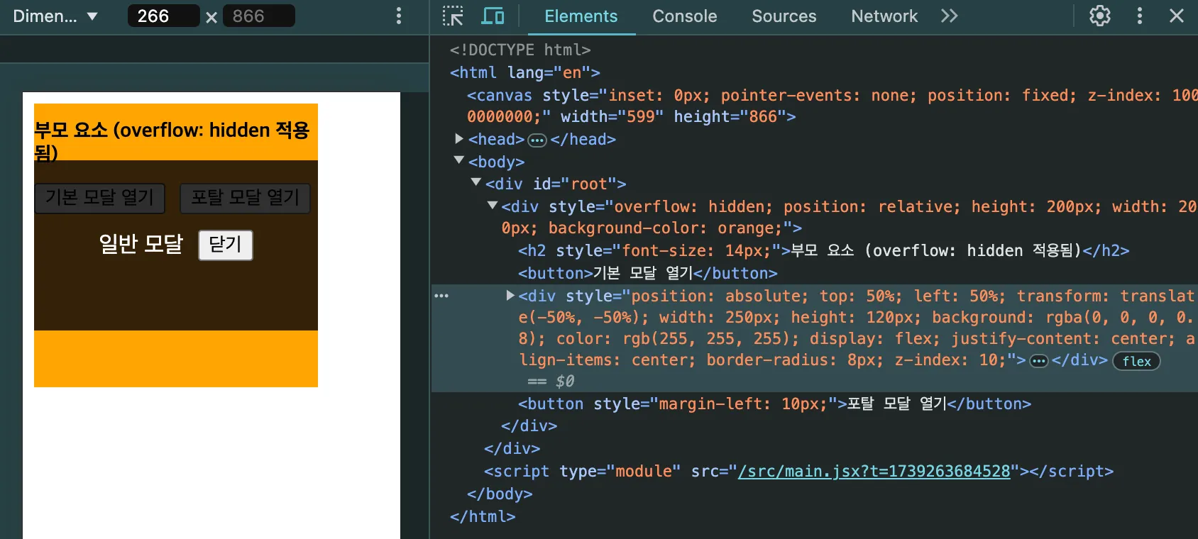 먼저, 두가지 상황을 코드로 구현한 것이다. 한개의 modal은 portal을 적용하지 않아 modal의 일부분이 hidden 처리가 될 것이고, 한개의 modal은 portal이 적용되어 최상단에 전체가 다 보일 것이다.