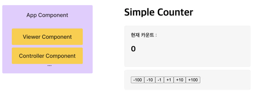 먼저, 앱의 구조는 아래와 같다. Viewer 컴포넌트는 현재 카운트를 보여주는 역할을 하고, Controller 컴포넌트는 카운트 계산 역할을 한다.