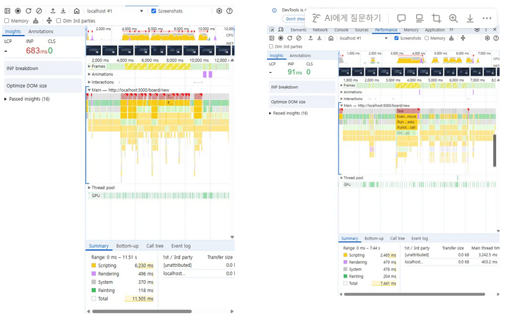 | INP (Interaction to Next Paint) | 683ms | 91ms | 약 86.7% 개선 |